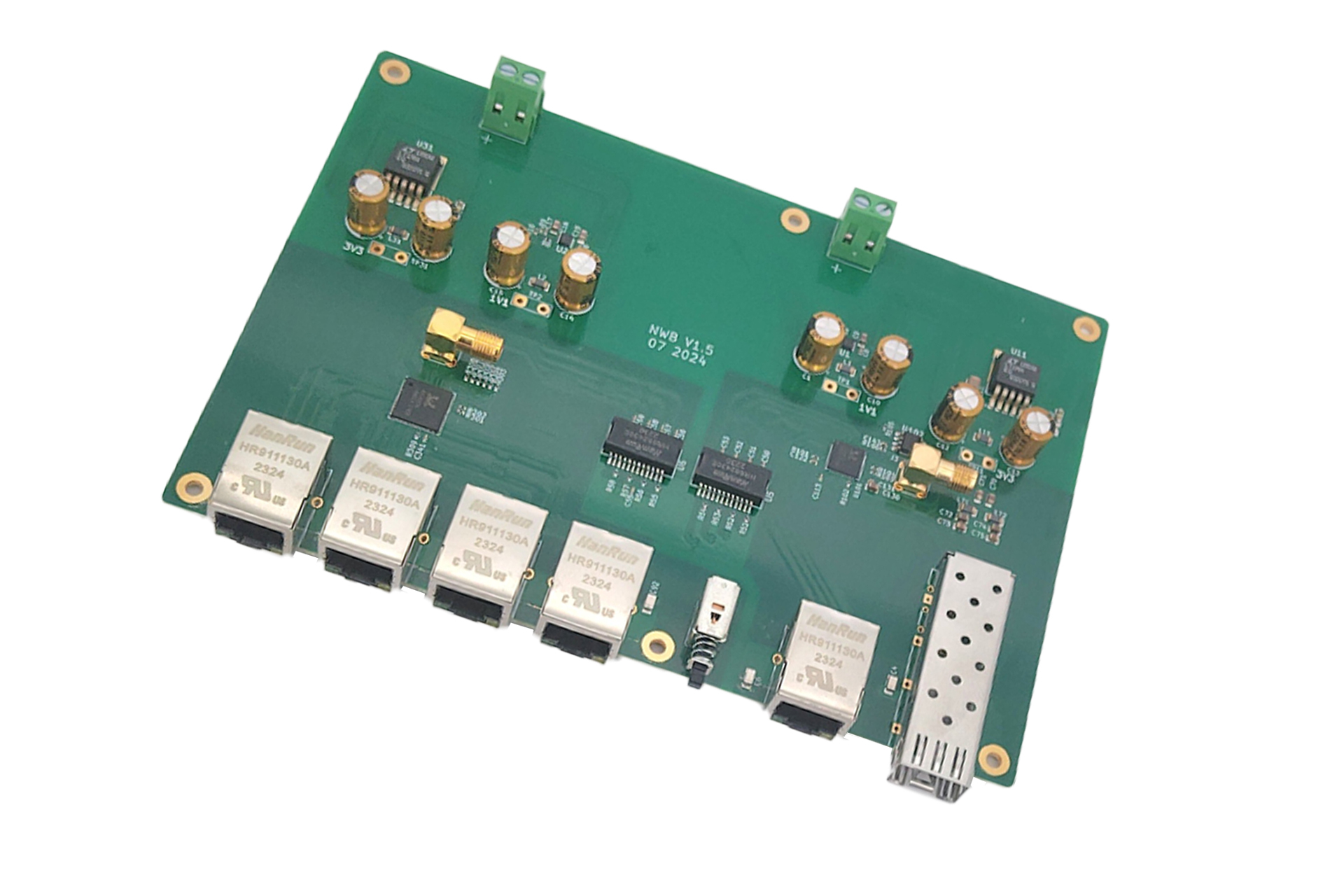 The network & clock module provides two SFP ports, which work in 1000Base-X or SGMII mode, 1000Mbps Only. This module uses a -95dB@1Hz and 1e-11@1s 10MHz OCXO as the reference clock, along with a BNC port for 10MHz input.