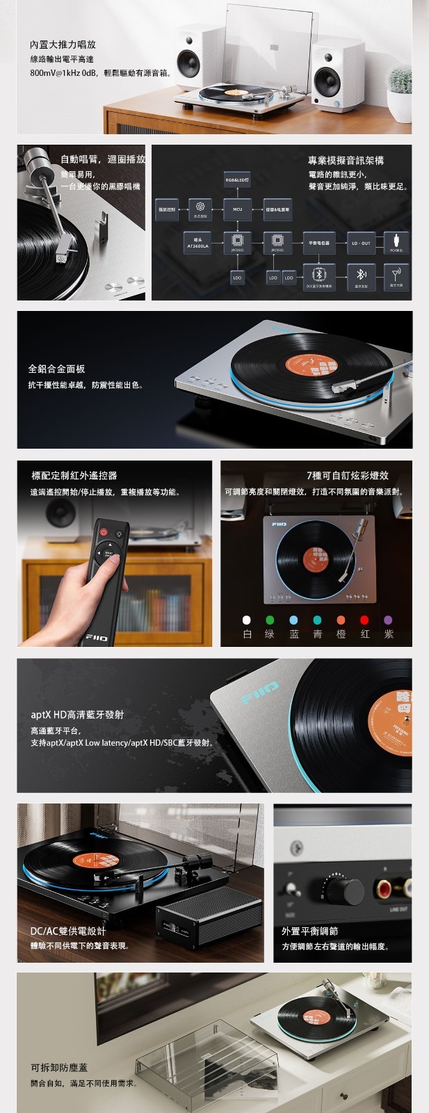自動唱臂 | 模擬音訊架構 | 內置大推力唱放|全鋁合金面板 | 7種可切換燈效 | 標配定制紅外遙控器aptX/aptX LL/aptX HD高清藍牙發射 | DC/AC雙供電設計 | 外置平衡調