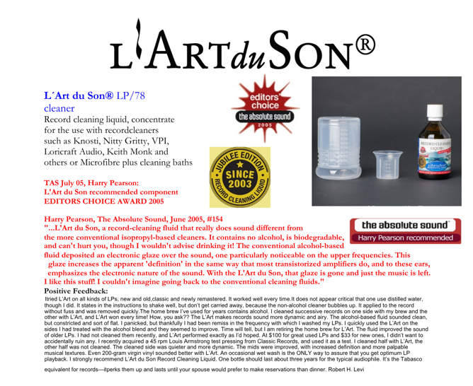 L'Art Du Son 是不含酒精的界面活生劑,並且是生物分解劑,完全無毒性,由Martina Schoner女士所研發,因為她長年在多家德國圖書館專門從事清洗黑膠唱片的職務。
