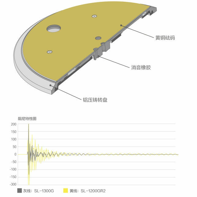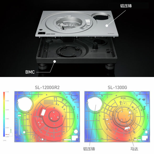 SL-1300G 採用雙層結構機身,將BMC(玻璃纖維增強塑膠)和鋁壓鑄轉盤牢固地結合在一起,確保實現高剛性。並且在頂部面板上的馬達/唱臂之間增加了加強筋,以提高剛性和減震特性。